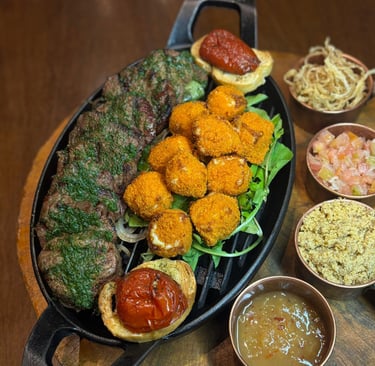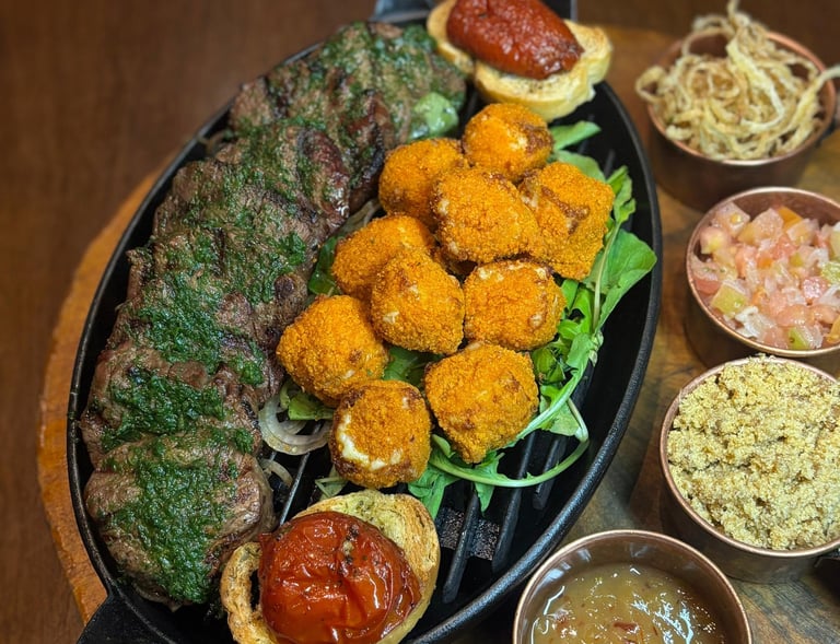 Fraldinha, mandioca frita, salada Juliene, ceviche de palmito, creme de espinafre, cebola em conserva e molho chimichurri com torradas.